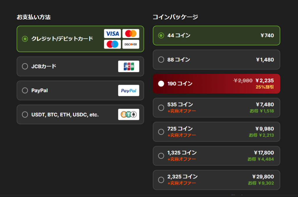 コインの購入方法は、各種クレジット/デビットカードの他にPayPal や仮想通貨でも購入が可能です
