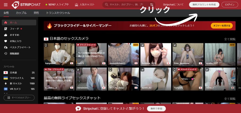 完全日本語対応(Googleの翻訳機能不要)で利用しやすく、海外ライブチャットサービスならではの無修正過激パフォーマンス(海外キャストが中心)を無料でも楽しめるのが魅力です